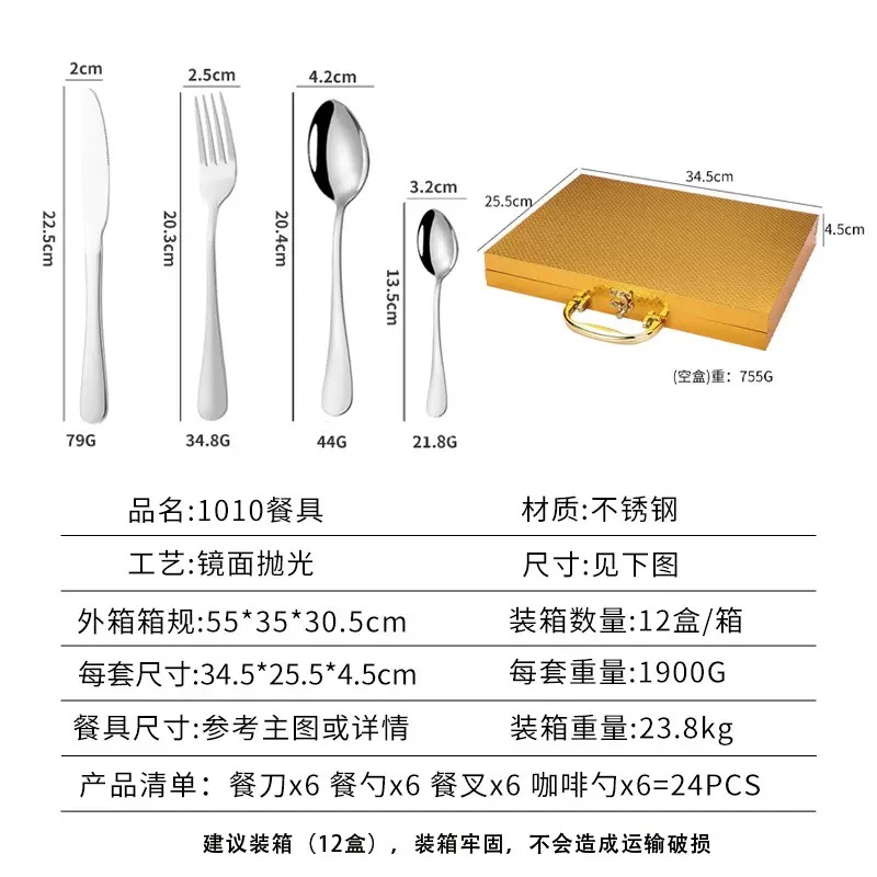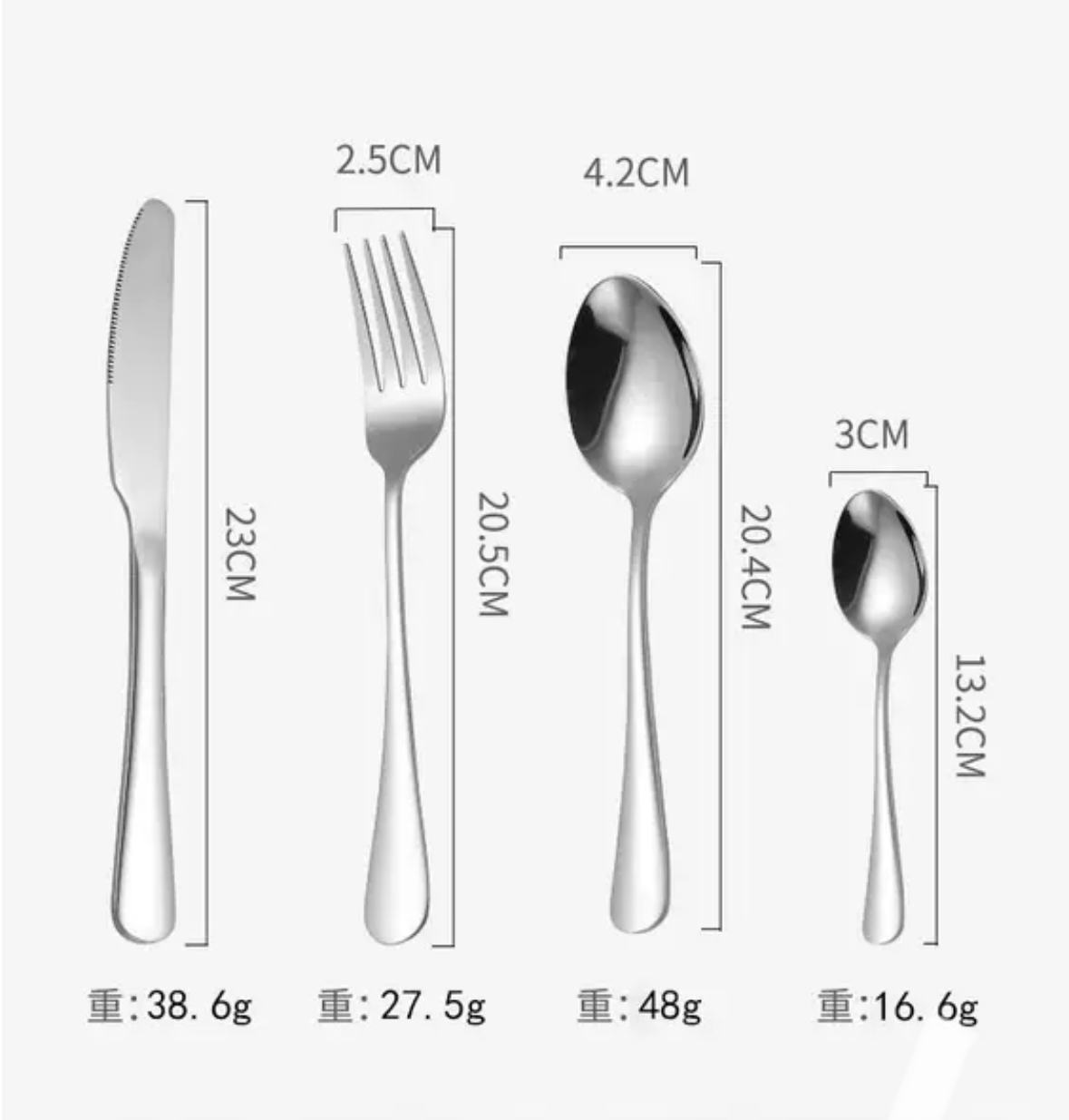 Set 24 Piezas Cuchillería - En tu mesa este set de 24 cubiertos son de la mejor calidad, funcionalidad y durabilidad. Cuenta con el tamaño perfecto en cada uno de sus cubiertos los cuales están pulidos con calidad y son de un resistente acero inoxidable. Disfruta de tus mejores preparaciones y de ocasiones especiales con la línea de Cuchillería. Finas piezas especialmente diseñadas en acero inoxidable. El acero mediante el cual se confecciona la cuchillería, contiene un alto porcentaje de cromo en su aleación, permitiendo que tenga una alta resistencia a la corrosión y al desgaste. Este alto porcentaje de cromo le otorga las propiedades anti oxidables, por lo que tu cuchillería no se oxidará ni manchará, cuando sea expuesta al contacto con alimentos, agua y humedad. Disfruta de exquisitas comidas o cenas junto a tu familia o amigos, todas las piezas vienen en un elegante estuche que, además, ofrece excelente presentación para regalo. Pulido ultra espejo. Características: * Material: Acero Inoxidable. * Piezas: 24 piezas. * Contenido: 6 Cuchillos / 6 Tenedores / 6 Cucharas / 6 Cucharitas. * Pulido Espejo. * Apto para lavavajillas. * Finas terminaciones de pulido. * Espesores que aseguran durabilidad y calidad. * Formas y tamaños funcionales.